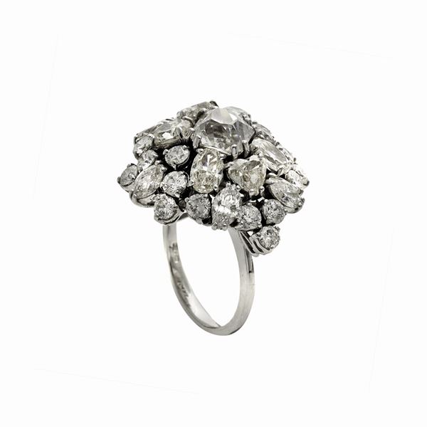 MATERIALE: oro bianco, diamanti e diamanti gialli DESCRIZIONE: anello piramidale realizzato con al centro grande diamante taglio mazarino incorniciato ai lati, a scalare, da due diamanti taglio cuore, quattro ovale, brillante e navette MISURE: 14 PESO: diamante centrale ct 2,44, diamanti taglio a cuore ct 2,98, ovale ct 10,1, brillante ct 2,45, gr 11,9