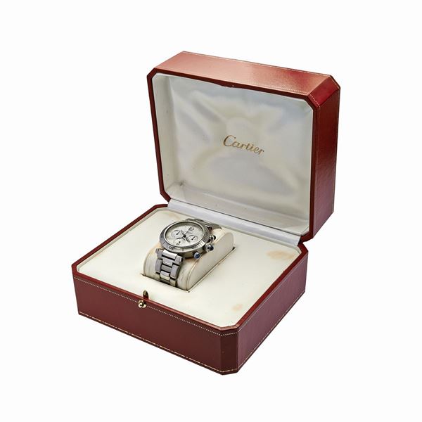 MATERIALE: in acciaio DESCRIZIONE: orologio da polso, cassa in tre corpi in acciaio, pulsanti cronografici e copri-corona a vite decorati da zaffiro cabochon, lunetta graduata, quadrante argente' inciso a motivi radiali, indici applicati puntiformi con inserto in materiale luminescente e numero arabo 12, registri dei 30 min. e delle 12 h ad ore 3 e 9, secondi continui con datario ad ore 6, movimento a carica automatica, cinturino originale Cartier in acciaio, corredato di scatola e garanzia MISURE: diam mm 38