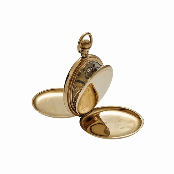 MATERIALE: oro giallo 18 kt DESCRIZIONE: orologio da tasca con doppia cassa in oro giallo liscio, corona di carica con anello ad ore 12, quadrante in smalto bianco con anello dei minuti e numeri romani in smalto nero, secondi ad ore 6, lancette piriformi traforate in blu, movimento a carica manuale firmato MISURE: diam mm 47 PESO: gr 105,2 lordo