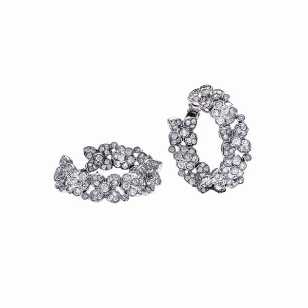 MATERIALE: oro bianco e diamanti DESCRIZIONE: paio di orecchini, ciascuno di forma circolare ovale, interamente impreziositi da diamanti taglio brillante MISURE: altezza cm 4 PESO: diamanti ct 8,00, colore F-G, purezza VVS-VS, gr 34,2