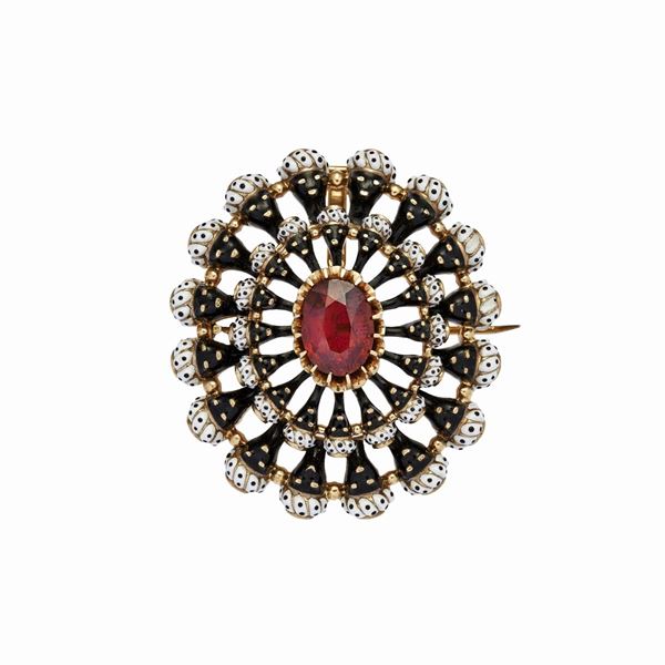 MATERIALE: oro giallo, granati e smalti color bianco e nero DESCRIZIONE: spilla centrata da granato ovale sfaccettato ed interamente incorniciata da due fasce di piccoli mori con turbante bianco disposti a raggera, bracciale en suite centrato a ventisette granati tra mori, coppia di gemelli, paio di orecchini e due pendenti simili tra loro MISURE: spilla cm 4,5x4, bracciale lunghezza cm 19,5, PESO: spilla gr 25,8, bracciale gr 31,1, gemelli, due pendenti e orecchini gr 14,7