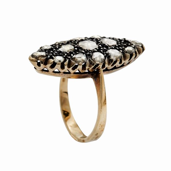 MATERIALE: oro a basso e diamanti DESCRIZIONE: Anello a losanga abbellito da rose di diamanti MISURE: anello 10 PESO: gr 5