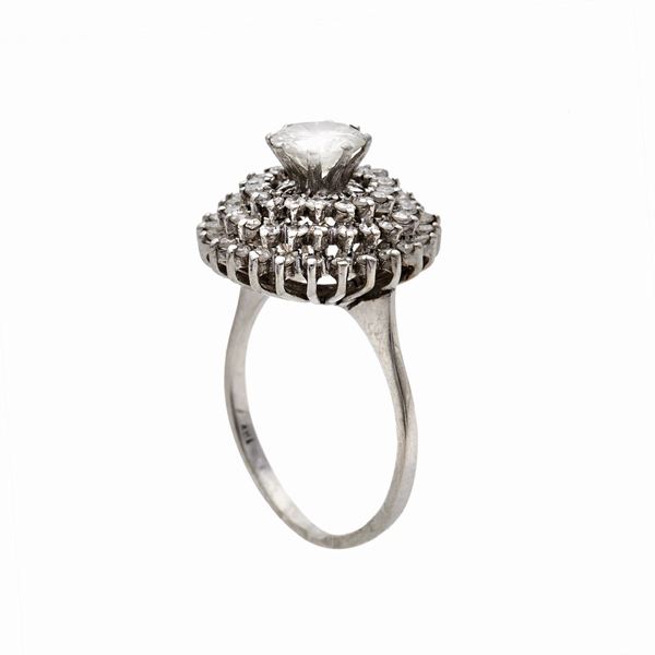 MATERIALE: oro bianco e diamanti DESCRIZIONE: anello realizzato con al centro diamante taglio brillante impreziosito da tre fasce con piccole foglie ciascuna con diamante taglio brillante, reca il marchio 18 kt MISURE: 17 PESO: diamant centrale ct 1,08, colore G purezza SI2, diamanti ct 0,60, gr 6,3