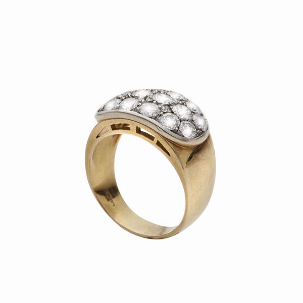 MATERIALE: oro giallo, oro bianco e diamanti DESCRIZIONE: anello a fascia realizzato con al centro pavè di brillanti, reca il marchio 750 MISURE: 17 PESO: diamanti ct 2,00, gr 10,7