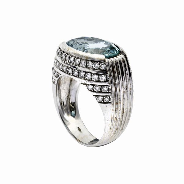 MATERIALE: oro bianco, diamanti e acquamarina DESCRIZIONE: anello realizzato con al centro acquamarina taglio ovale, in alta montatura con ai lati diamanti taglio brillante MISURE: anello 15 PESO: gr 14.6