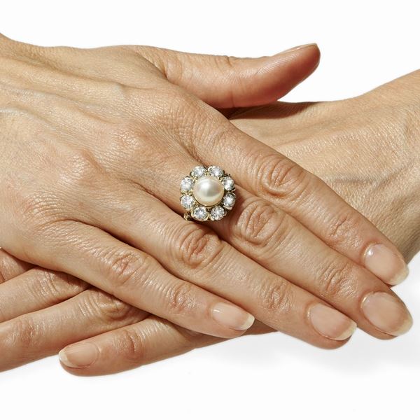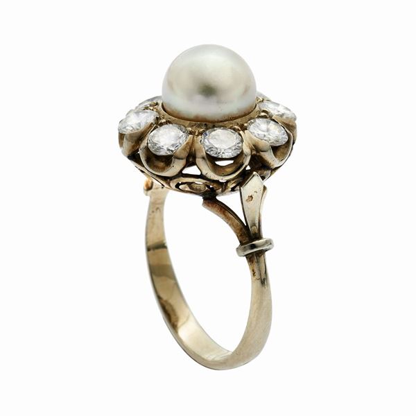 MATERIALE: oro bianco, diamanti e perla DESCRIZIONE: anello a margherita, realizzato con al centro perla incorniciata da diamanti taglio brillante MISURE: 20 PESO: perla mm 9.40, diamanti ct 1.60, colore G, purezza SI, gr 8.7