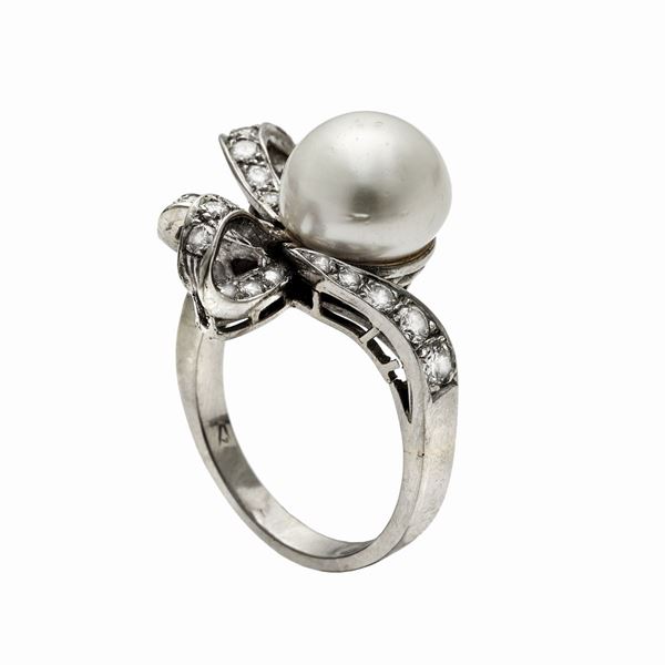 MATERIALE: oro bianco, diamanti e perla DESCRIZIONE: anello in oro bianco con perla centrale e fiocco impreziosito da diamanti taglio brillante MISURE: anello 18 PESO: anello gr 10.7, perla mm 11.40, diamanti ct 0.70, colore H, purezza SI, gr 10.7