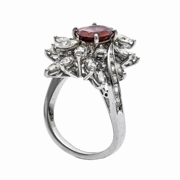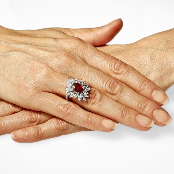 MATERIALE: oro bianco, diamanti e rubino DESCRIZIONE: anello realizzato con al centro rubino taglio ovale, impreziosito da diamanti taglio navette e taglio baguette, reca il marchio 750 MISURE: anello 14 PESO: rubino ct 2.10, diamanti ct 3.0, colore G, purezza VS, gr 8.1