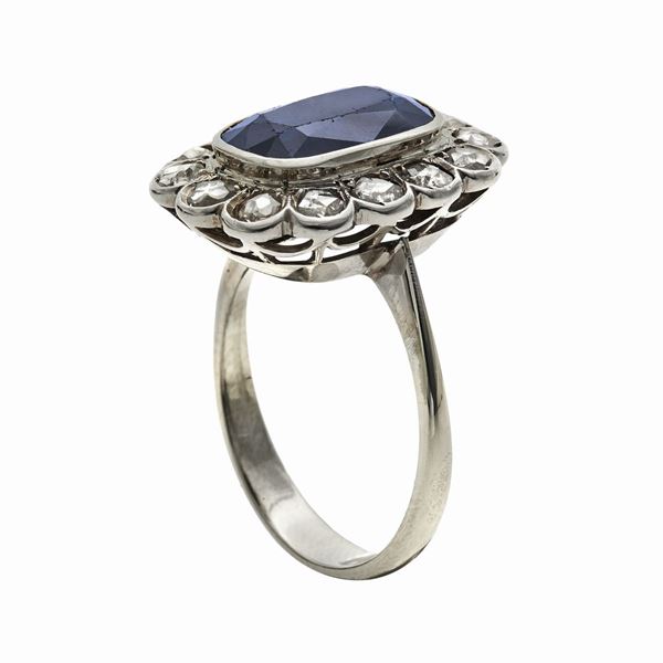 MATERIALE: oro bianco, diamanti e zaffiro DESCRIZIONE: anello realizzato con con zaffiro taglio cuscino incorniciato da rose coronè di diamanti, reca il marchio 750, zaffiro leggermente consumato MISURE: anello 16 PESO: zaffiro ct 3.90, diamanti ct 0.70, gr 6.6