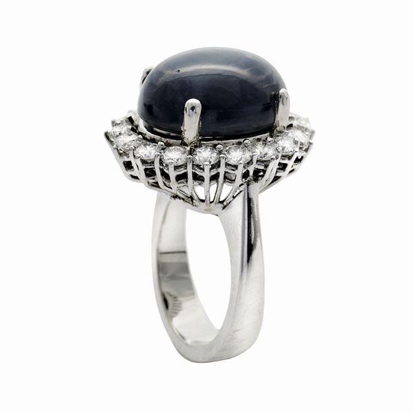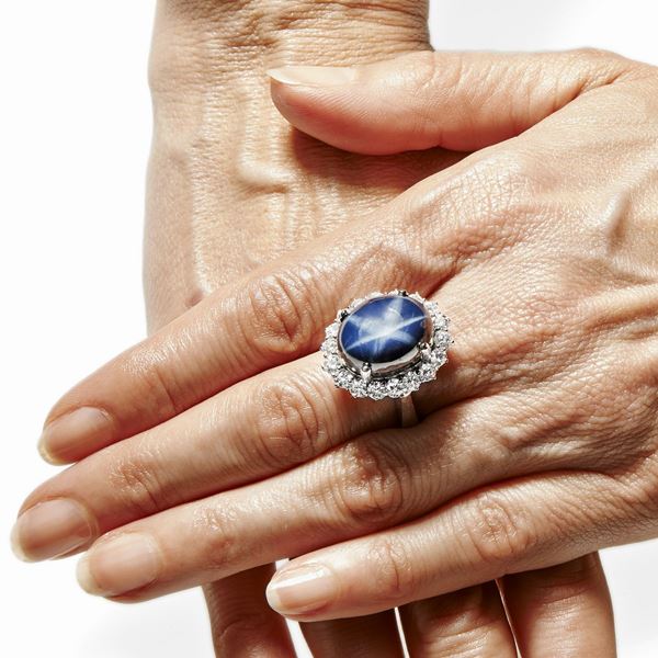 MATERIALE: oro bianco, diamanti e zaffiro stellato DESCRIZIONE: anello realizzato con al centro grande zaffiro stellato taglio cabochon incorniciato da diamanti taglio brillante, reca il marchio 750 MISURE: anello 14 PESO: zaffiro stellato ct 22, corredato di certificato rilasciato da Gemmological Certification Services numero 5777-9106 in data 02 marzo 2017, diamanti ct 1.80, gr 19.7