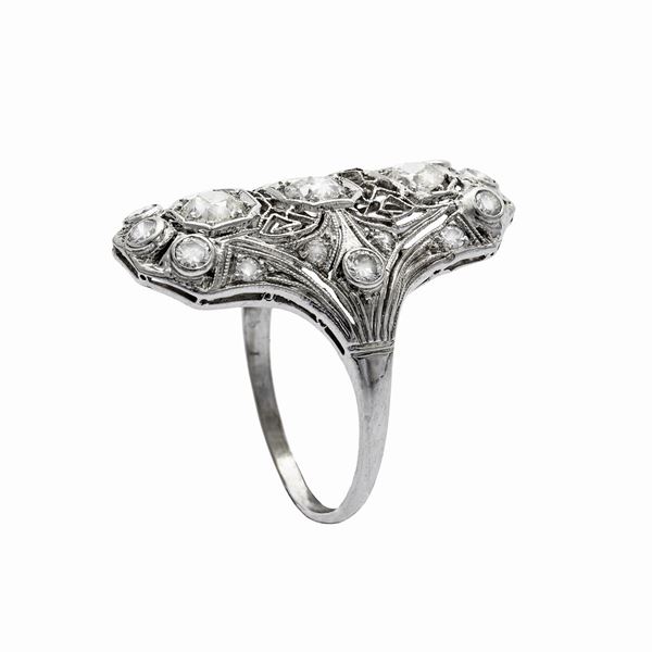 MATERIALE: oro bianco e diamanti DESCRIZIONE: anello a losanga, realizzato a tricot, con al cnetro tre diamanti taglio vecchio impreziositi da motivi geometrici stilizzati in parte abbelliti da diamanti più piccoli sempre taglio vecchio MISURE: anello 17 PESO: diamanti ct 1.0 circa, gr 5.7