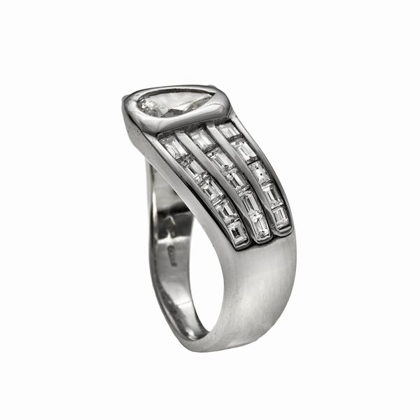 MATERIALE: oor bianco e diamanti DESCRIZIONE: anello a fascia realizzato con al centro diamante taglio goccia fra diamanti taglio baguette disposti su tre fasce, reca il marchio 750 MISURE: anello 13 PESO: diamanti ct 1.20, gr 7.1