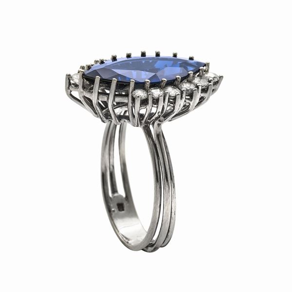 MATERIALE: oro bianco, diamanti e zaffiro DESCRIZIONE: anello realizzata con grande zaffiro taglio navette impreziosito ai lati da diamanti taglio brillante MISURE: anello 16 PESO: zaffiro ct 4.80, diamanti ct 0.66, colore G-H, purezza VVS, gr 5.4