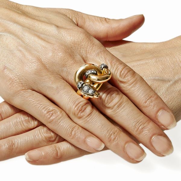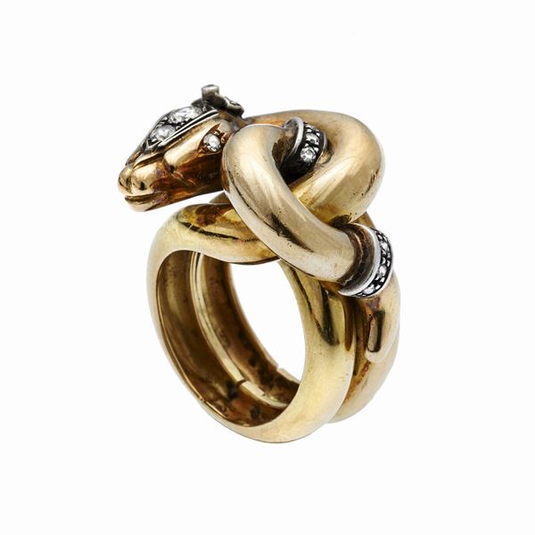 MATERIALE: oro giallo, argento e diamanti DESCRIZIONE: anello realizzato come un serpente annodato, con testa e occhi impreziositi con diamanti taglio brillante che si ritrovano anche in due fasce sulla coda MISURE: anello 15 PESO. diamanti ct 0.50, gr 24.0