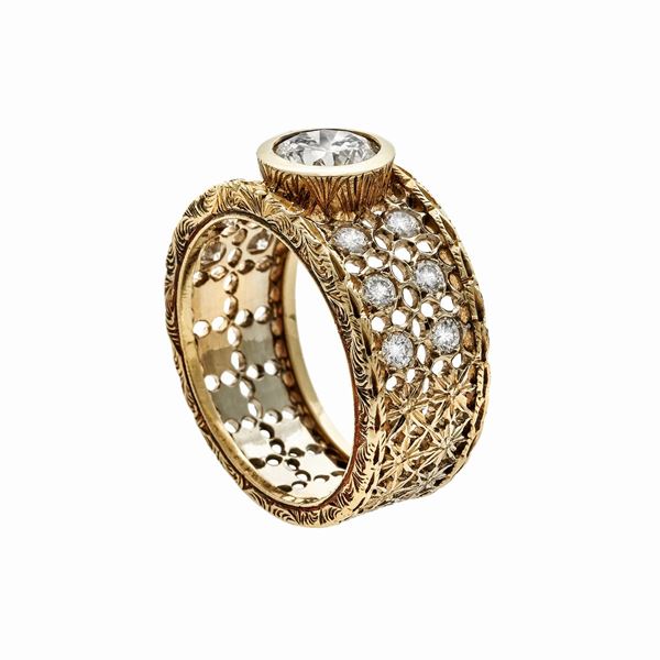 MATERIALE: oro giallo e diamanti DESCRIZIONE: anello a fascia, in stile fiorentino, con al centro diamante taglio brillante, fascia realizzata a tricot impreziosita da dodici diamanti taglio brillante MISURE: 13 PESO: diamante centrale ct 1.10, colore H, purezza VS, altri brillanti ct 0.24, gr 7