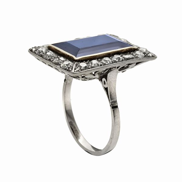 MATERIALE: platino, diamanti e zaffiro DESCRIZIONE: anello realizzato con al centro grande zaffiro taglio rettangolare incorniciato da diamanti taglio vecchio MISURE: anello 16 PESO: zaffiro ct 10.0, diamanti ct 1.40, colore H-I, purezza SI, gr 9.3