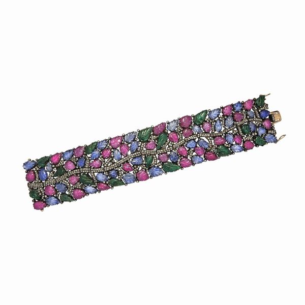 MATERIALE: diamanti brown, smeraldi, rubini e zaffiri DESCRIZIONE: bracciale semirigido, di ispirazione floreale, realizzato con radici di smeraldo, di rubino e di zaffiro, ciascuna tagliata come una foglia e con diamanti brown taglio brillante MISURE: aperto cm 19, h 4 cm PESO: gr 87,4