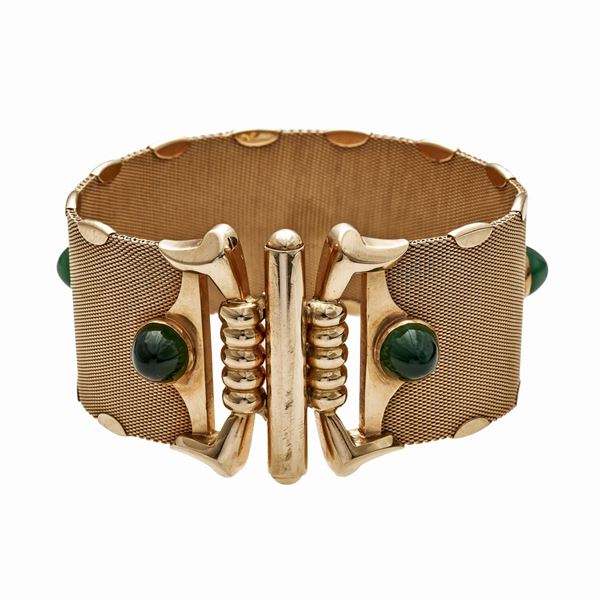 MATERIALE: oro giallo e pietre verdi DESCRIZIONE: bracciale realizzato ad imitazione del tessuto, con grande fermezza che ricorda una fibbia leggermente bombata e baccellata, impreziosito da cinque pietre verdi taglio cabochon, reca il marchio 20 VR e 750 MISURE: aperto cm 19.3 PESO: gr 97.8
