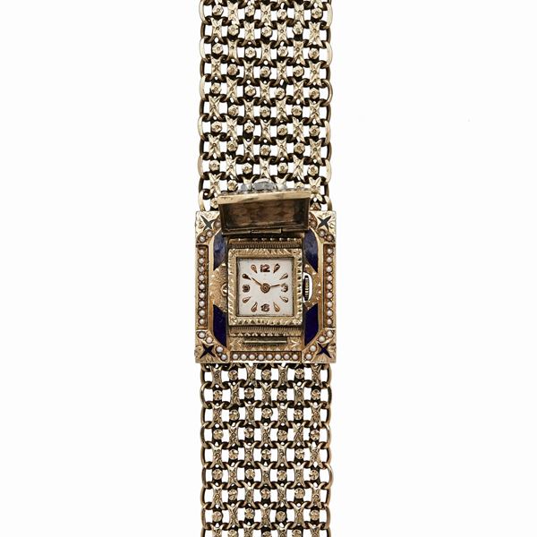 MATERIALE: oro a basso titolo, diamanti, microperle smalto nero DESCRIZIONE: bracciale-orologio a fascia realizzato come maglie di tessuto con al centro cassa quadrata incisa in oro, impreziosita da smalto nero e microperle, con sportellino impreziosito da giglio in diamanti taglio brillante, all'interno orologio con quadrante quadrato, indici d'oro applicati e lancette d'oro a bastone, carica a ore 3, reca il marchio 14k, orologio da revisionare MISURE: quadrante mm 10x10, bracciale cm 2.5x8.5 h PESO: gr 68.7