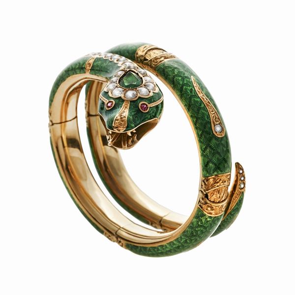 Bracciale Serpente in oro giallo, smalto verde, diamanti e smeraldi
