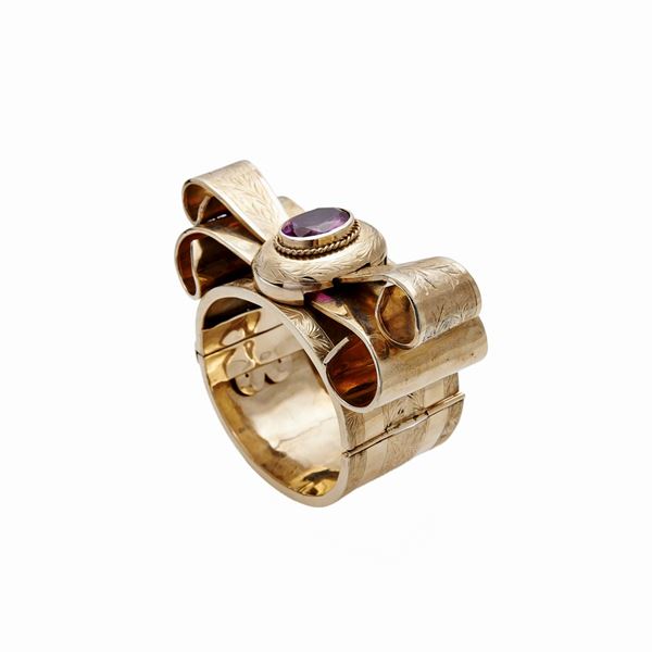 MATERIALE: oro giallo a 12 kt e pietra rosa DESCRIZIONE: grande bracciale rigido realizzato con grande fiocco impreziosito da pietra rosa taglio ovale, fascia incisa con fiori, reca il marchio 500 MISURE: diam int cm PESO: 97,8 gr