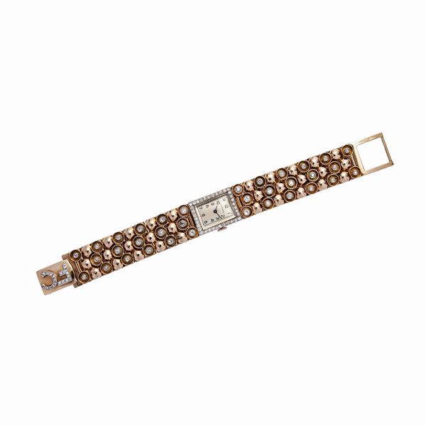 MATERIALE: oro giallo, oro bianco e diamanti DESCRIZIONE: orologio da polso, cassa rettangolare, lunetta impreziosita da diamanti taglio brillante, quadrante oro con numeri arabi in nero, lancette a bastone, movimento a carico manuale, cinturino in oro realizzato con semisfere a rilievo alternate a borchie, ciascuna impreziosito da diamanti, chiusura con applicate le iniziali FC con diamanti taglio brillante MISURE: mm 15 PESO: gr 50.3 lordi