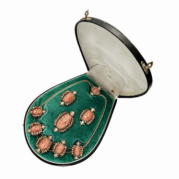 MATERIALE: oro giallo a basso titolo e corallo DESCRIZIONE: parure composta da collana realizzata con cammei scolpiti ad altorilievo come profili femminili, ogni cammeo è incorniciato con elementi floreali, paio di orecchini e pendente en suite, corredato da scatola originale MISURE: collana aperta cm 46, pendente cm 4x6h, orecchini cm 3x4h PESO: collana gr 60.6, pendente gr 19.6, orecchini gr 24 DA VALUTARE