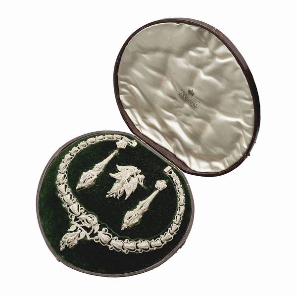 MATERIALE: oro a basso titolo, madreperla e microperle DESCRIZIONE: parure composta da girocollo d'ispirazione floreale realizzato a maglie che ricordano foglie intrecciate l'una con l'altra, con fiore stilizzato come pendente, spilla e orecchini en suite, corredato di scatola originale, lievissimi difetti MISURE: collana aperta cm 42, orecchini cm 9 h, spilla cm 6 h PESO: totale gr 47.5