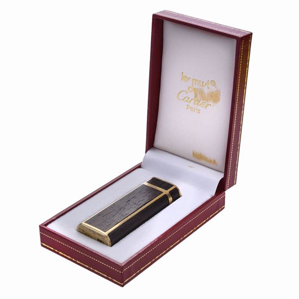 AMATERIALE oro giallo e bois de rose DESCRIZIONE: accendino a gas rivestito in bois de rose e con profili in oro giallo, firmato Cartier Paris, reca il marchio 750, corredato di scatola originale MISURE: cm 7x2.5