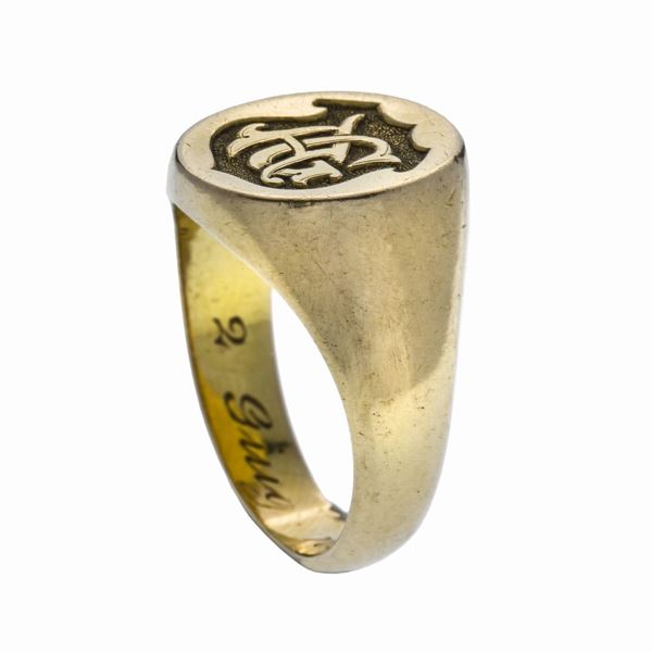 MATERIALE: oro giallo DESCRIZIONE: anello Chevalier con incise, entro scudo le lettere A G, all'interno è inciso Giugno 59 e reca il marchio 750 MISURE: anello 17 PESO: gr 14.3