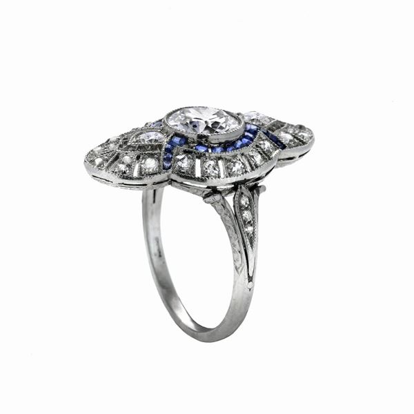 MATERIALE: platino, diamanti e zaffiri DESCRIZIONE: anello con losanga polilobata, al centro diamante taglio vecchio incorniciato da zaffiri taglio carrè, profilo traforato impreziosito con diamanti taglio vecchio, uno zaffiro mancante MISURE: anello 10 PESO: diamante centrale ct 1.30, diamanti ct 0.50, gr 4,8
