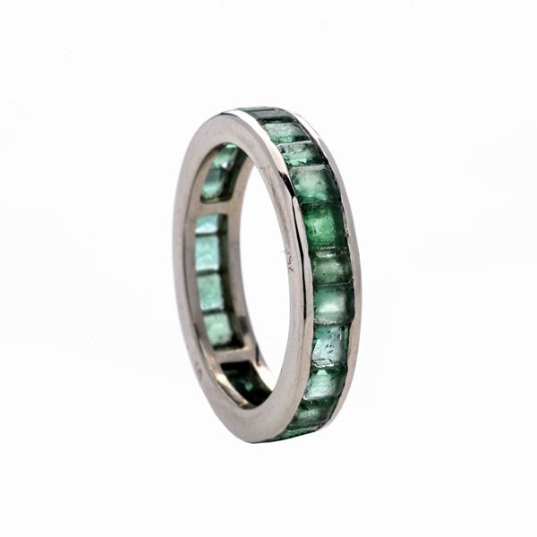 MATERIALE: oro bianco e smeraldi DESCRIZIONE: anello eternè in oro bianco con smeraldi taglio carrè, reca il marchio 750, pietre consumate MISURE anello 13 PESO: gr 4,3