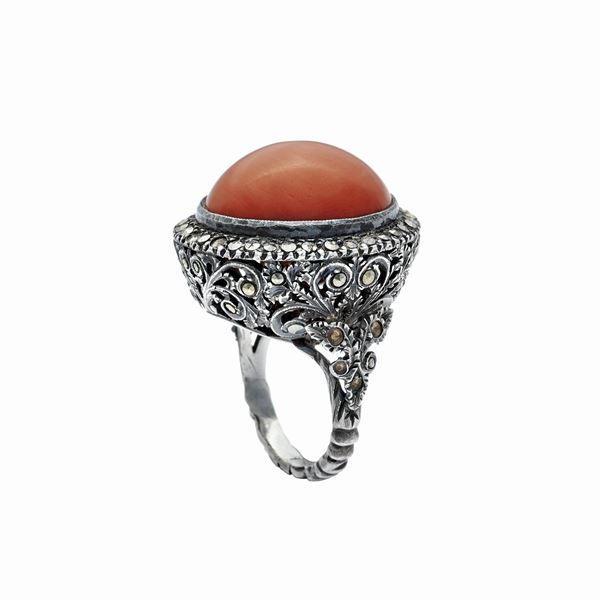 MATERIALE: argento, marcassite e corallo rosso DESCRZIONE: anello realizzato con al centro grande corallo rosso taglio cabochon, incorniciato da marcassite tagliata a punta di diamante su alta base realizzata a tricot con volute di foglie e tralci impreziosite anch'esse da marcassite, marcassite mancante in alcuni punti MISURE: anello 11 PESO: gr 13.1
