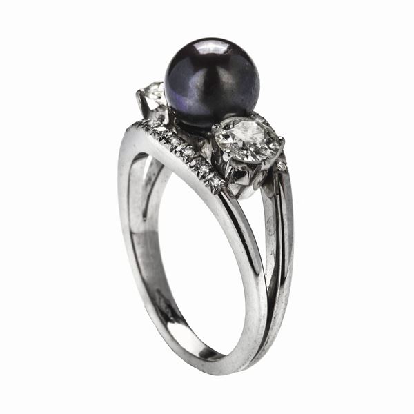 MATERIALE: oro bianco, diamanti e perla Tahiti DESCRIZIONE: anello realizzato con al centro una perla tahiti tra due diamanti taglio brillante e piccoli diamanti sulla base, reca il marchio 750 MISURE: anello 19 PESO: perla diam mm 6, diamanti ct 1.40 complessivi, colore I, purezza I2. gr 9.1