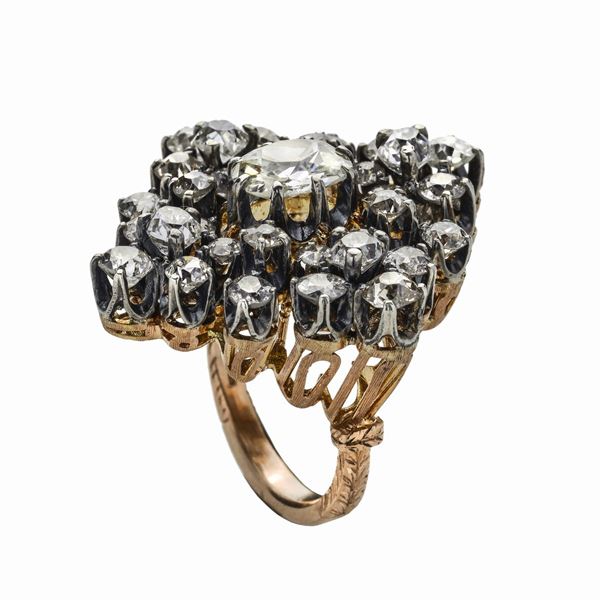 MATERIALE: oro giallo, argento e diamanti DESCRIZIONE: anello di ispirazione floreale, con al centro diamante taglio vecchio ovale, incorniciato da diamanti taglio vecchio disposti come fiori in maniera romboidale MISURE: anello 13 PESO: diamante centrale ct 1.05, contorno diamanti ct 3.0, gr 12.2