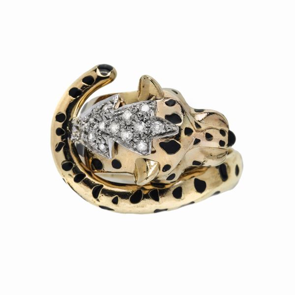 MATERIALE: oro giallo, smalto e diamanti DESCRIZIONE: anello realizzato come un giaguaro con la testa impreziosita da pavé di brillanti, occhi in smeraldi e corpo con macchie in smalto nero, con anello interno per la riduzione della misura MISURE: anello 9 PESO: gr 15.0