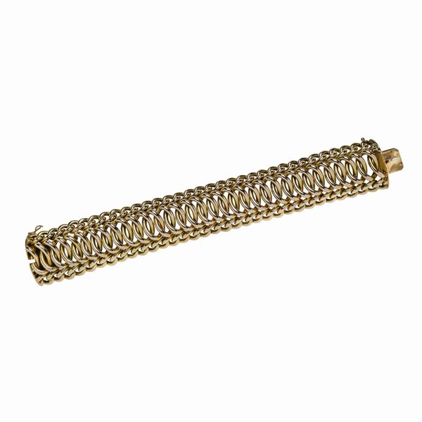 MATERIALE: oro giallo DESCRIZIONE: alto bracciale realizzato a maglie ovali, bombate, intrecciate tra loro MISURE: aperto cm 20 PESO: gr 86.2