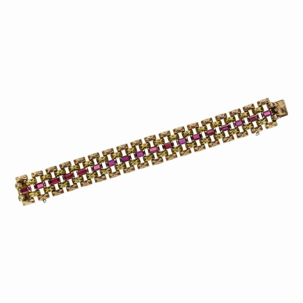 MATERIALE: oro giallo, oro rosa e pietre rosse DESCRIZIONE: bracciale realizzato con quattro file di maglie rettangolari bombate, ciascuna caratterizzata da motivo a X, alternate ad una fila di pietre rosse di taglio rettangolare, reca il marchio 18 kt MISURE: aperto cm 18.7 PESO: gr 39.1