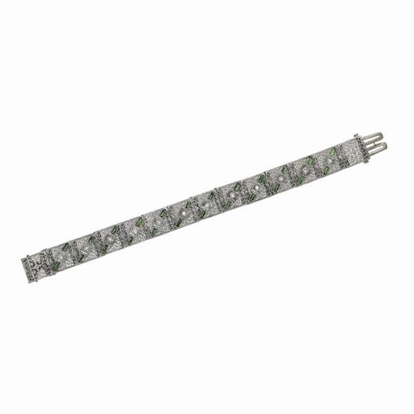 Bracciale in platino, oro a basso titolo, pietre verdi e diamanti
