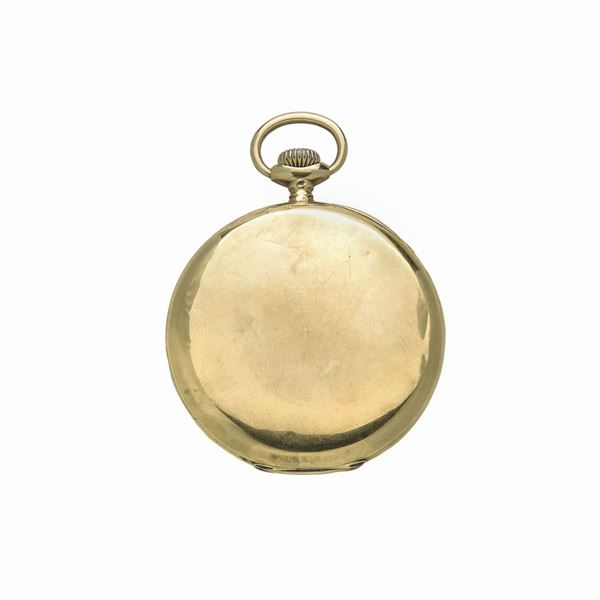 MATERIALE: oro giallo 18 kt DESCRIZIONE: orologio da tasca, cassa liscia in oro giallo, quadrante in smalto on numeri arabi, lancette douphine, quadrante supplementare dei secondi ad ore 6, movimento a carica manuale, da revisionare MISURE: mm 47 PESO: gr 66.6