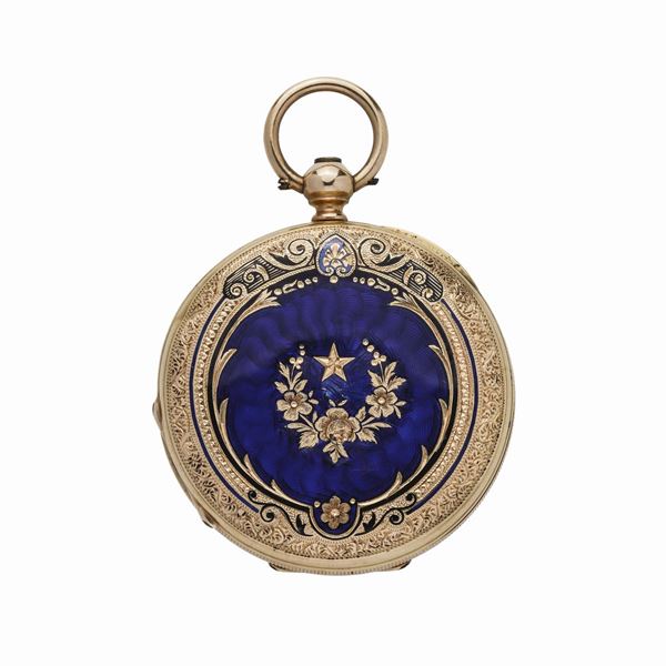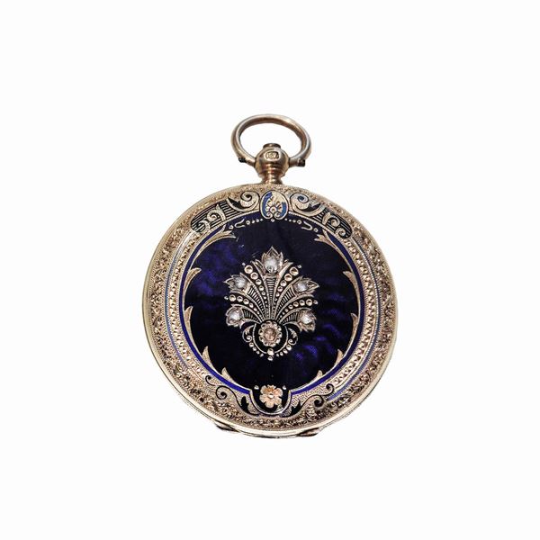 Orologio da tasca in oro giallo, smalto blu e diamanti