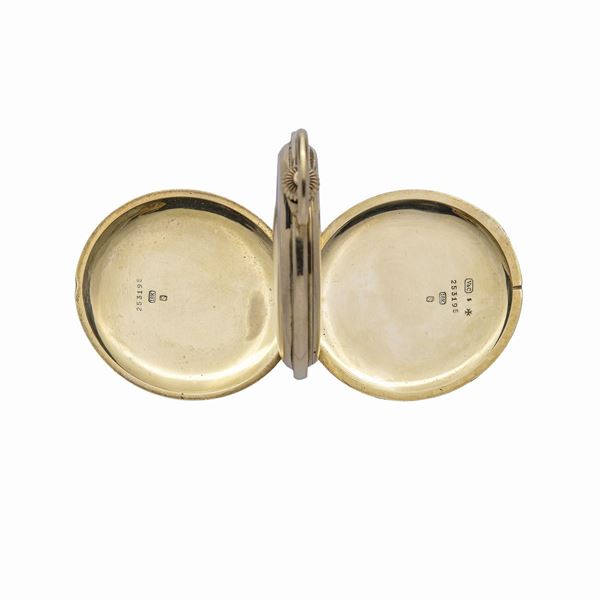 MATERIALE: oro giallo 18kt DESCRIZIONE: orologio da tasca con doppia cassa, lunetta di carica ad ore 3, quadrante firmato con numeri arabi, quadrante ausiliario dei secondi ad ore 6, movimento manuale, firma incisa, marchio 750, non funzionante e da revisione MISURE: diam mm 40 PESO: 91.3 lordi