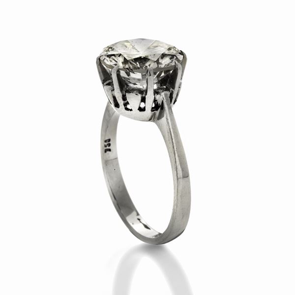 MATERIALE: oro bianco e diamante DESCRIZIONE: anello solitario con al centro grande diamante taglio brillante, montato con otto griffe, reca il marchio 750 MISURE: anello 17 PESO: diamante ct 5.0, colore Light Brown, purezza I1, gr 5.4