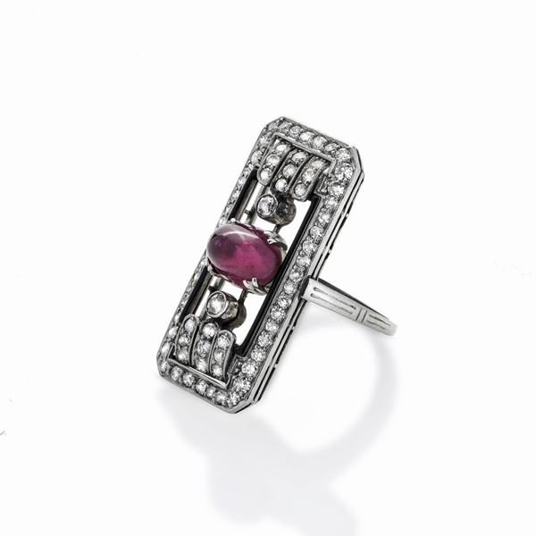 MATERIALE: platino, smalto nero, diamanti e rubino DESCRIZIONE: anello a losanga realizzato con al centro rubino taglio cabochon ovale interamente impreziosito da diamanti taglio vecchio e profili interni in smalto nero, completo di anello interno per la rimessa a misura MISURE: anello 12 PESO: rubino ct 2.0, diamanti ct 1.30, colore I, purezza VS, gr 10.8