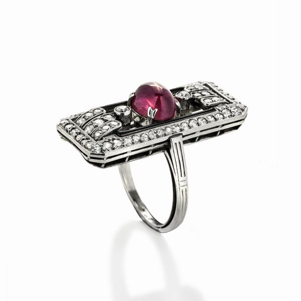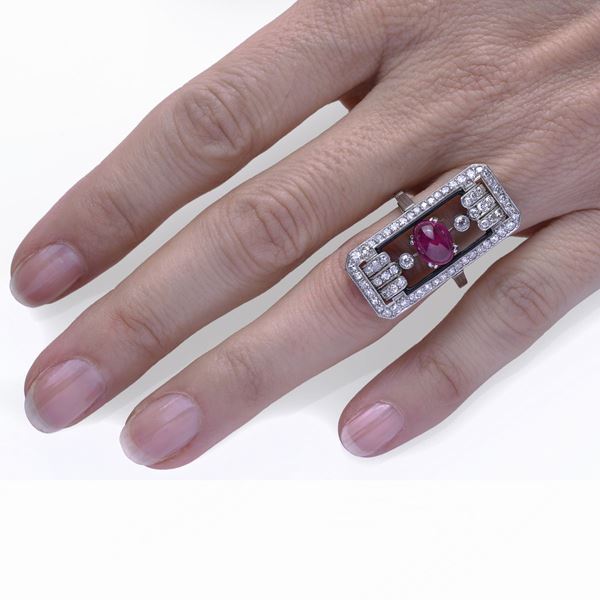 Anello a losanga in platino, smalto nero, diamanti e rubino