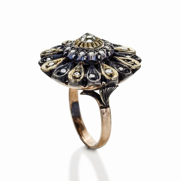 MATERIALE: oro a basso titolo, argento e diamanti DESCRIZIONE: anello realizzato come un fiore, al centro diamante taglio rosa coronè, petali realizzati in oro e argento e ciascuno impreziosito da diamanti wit wit MISURE: anello 16 PESO: gr 9.9