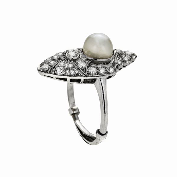 MATERIALE: oro bianco, diamanti e perle DESCRIZIONE: anello realizzato a tricot come una foglia stilizzata interamente impreziosita da diamanti taglio vecchio e centrata da perla MISURE: anello 13 PESO: diamanti ct 0.50, gr 5.2