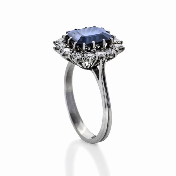 Anello in oro bianco, diamanti e zaffiro