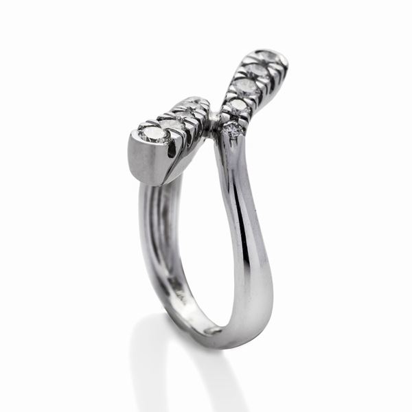 MATERIALE: oro bianco e diamanti DESCRIZIONE: anello interamente impreziosito da diamanti taglio brillante, firmato Damiani, reca il marchio 750 MISURE: anello 15 PESO: diamanti ct 0.40, gr 5.1