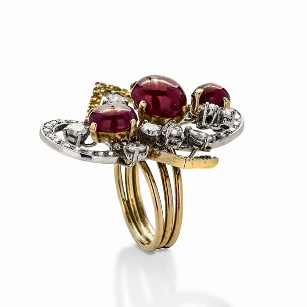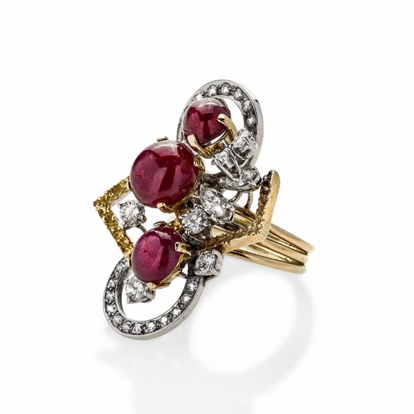 Anello in oro bianco, oro giallo, diamanti e rubini